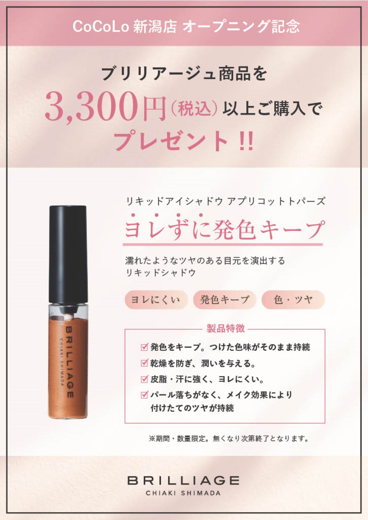 POP UPを記念して、ブリリアージュ製品¥3,300(税込)以上ご購入のお客様へ、「リキッドアイシャドウ アプリコットトパーズ」をプレゼントいたします。