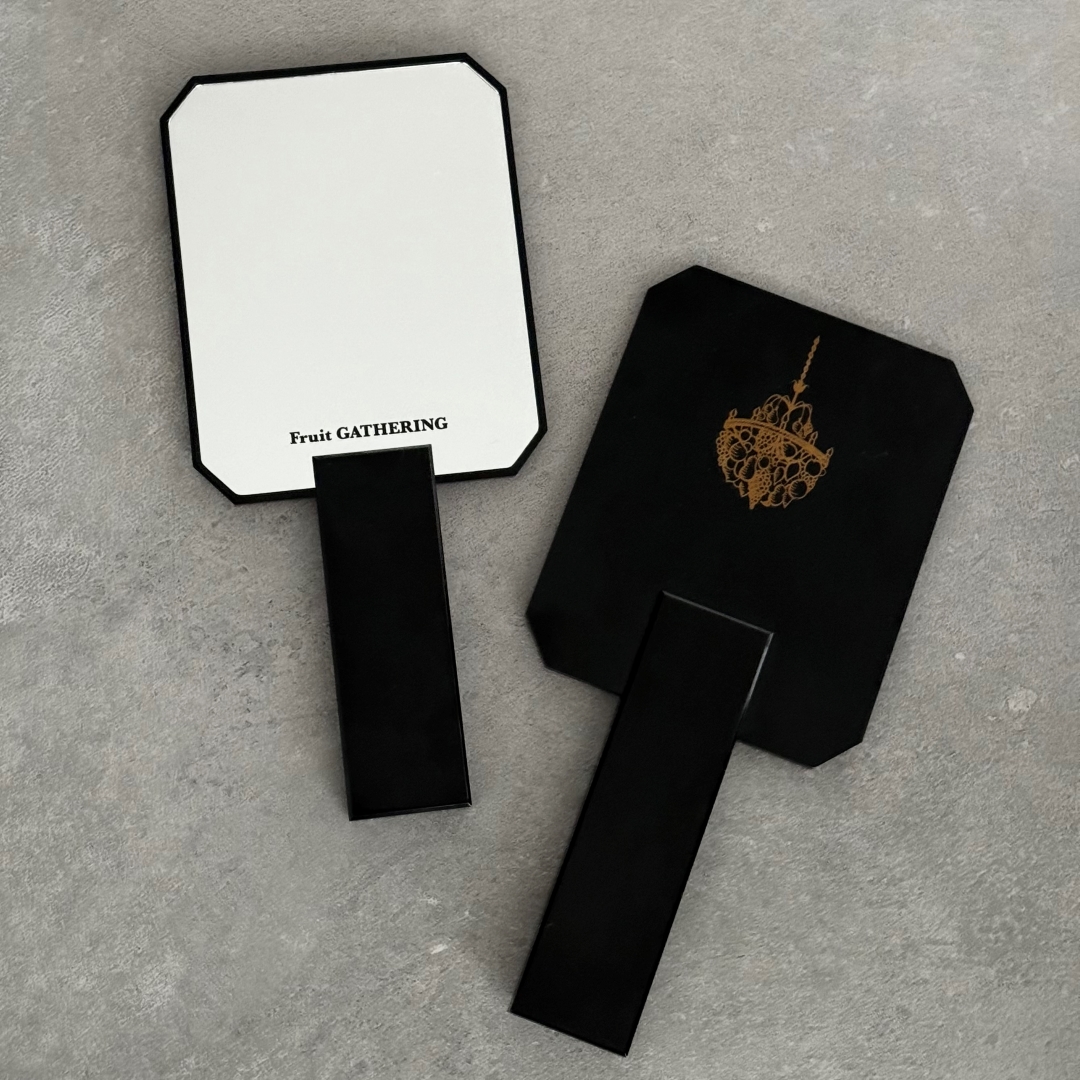 フルーツギャザリングのシンボルでもあるフルーツシャンデリアをゴールドの箔押しでデザインしたシックなハンドミラー。