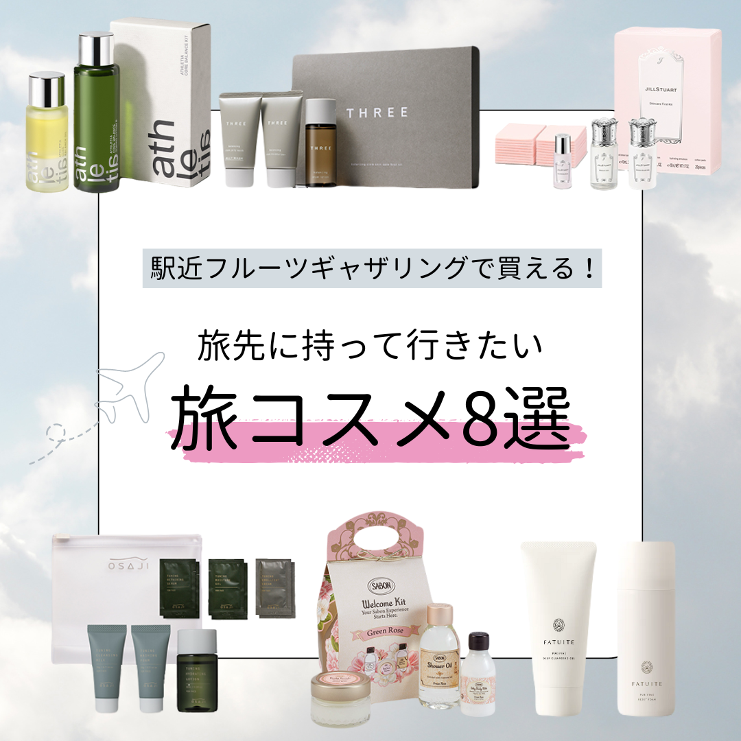 駅近にあるフルーツギャザリングでは、旅行や出張に便利なトラベルサイズのスキンケアやヘアケアをご用意しています。