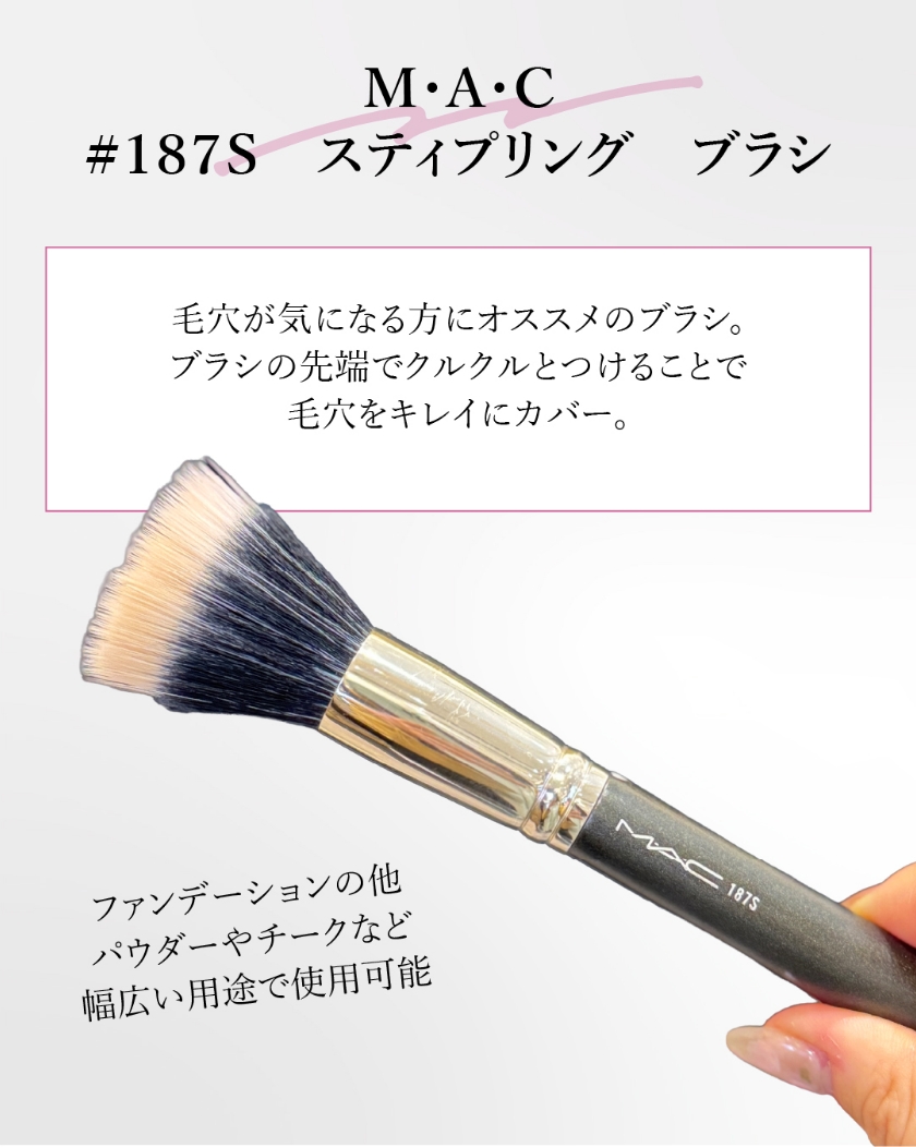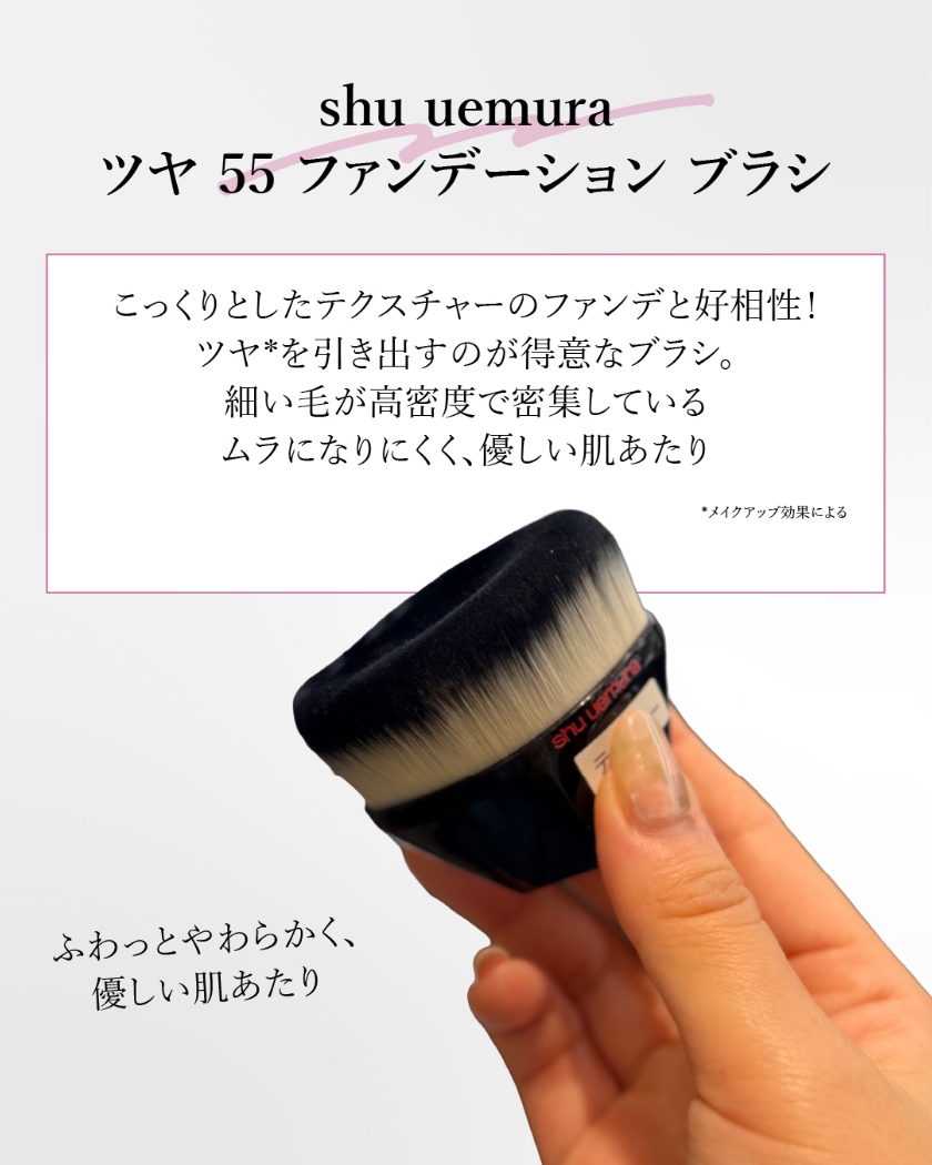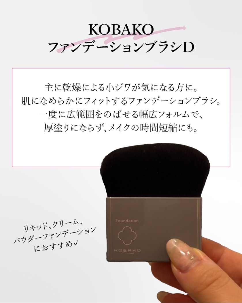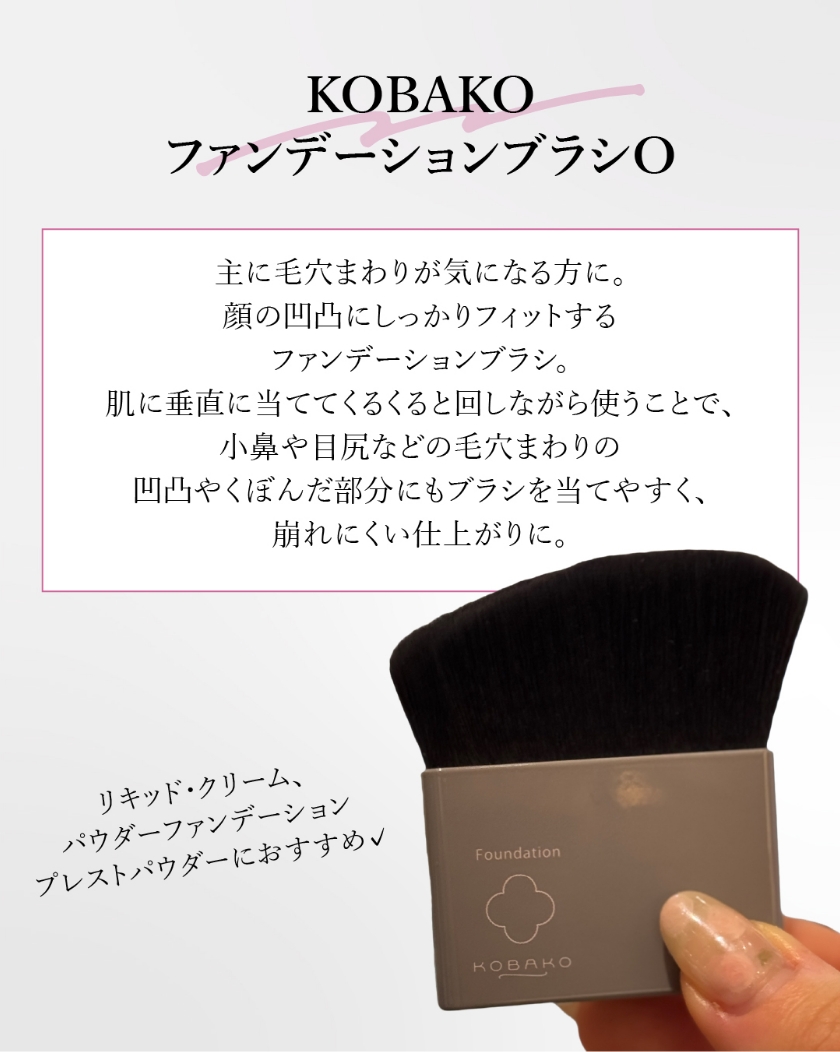 ブラシを使うことで、簡単にムラなく均一にファンデーションをのせることができます。 ファンデーションが肌に密着して崩れにくくなったり、毛穴をカバーし、なめらかな印象の仕上がりに!