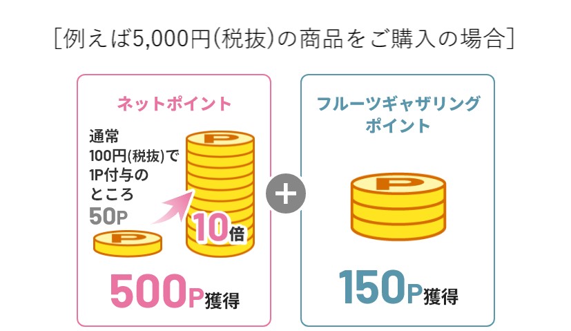 通常100円(税抜)でネットポイント1ポイント付与のところ、フルーツギャザリング アプリでご購入いただくといつでも10倍にアップ!